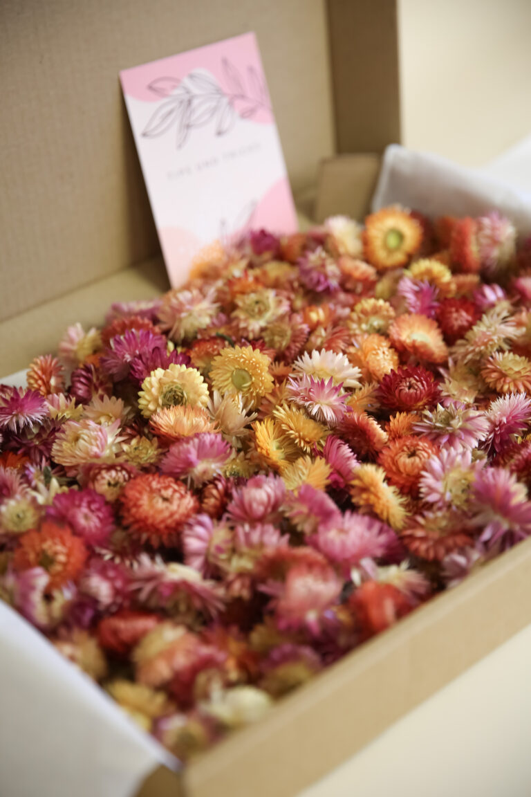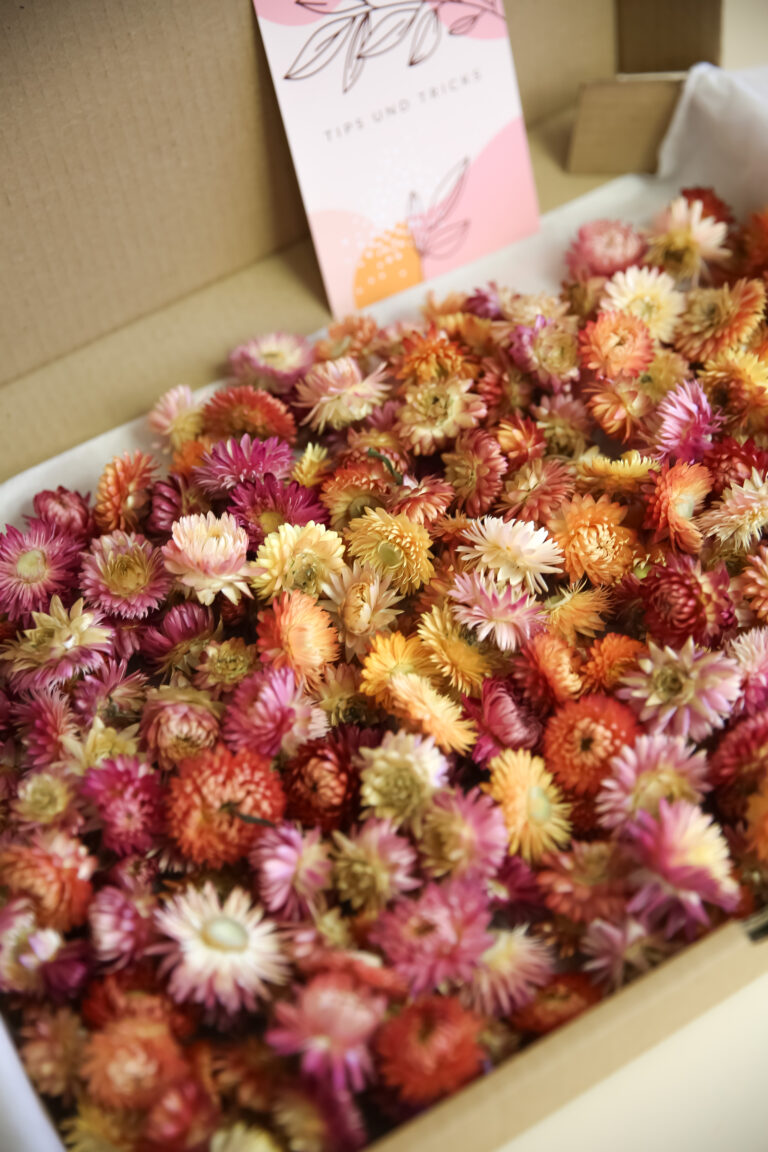 Die schönsten Trockenblumen auf ganzer Linie: Unsere Box mit liebevoll ausgewählten Strohblumen Blütenköpfen in bunten Tönen ist ein echtes Highlight für kreative Projekte.