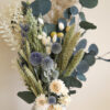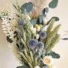 Nordic Calm ist ein handgebundener Trockenblumenstrauss, der mit seiner ruhigen Farbpalette und natürlichen Struktur überzeugt. Grüner Eukalyptus bringt Frische und Leichtigkeit ins Arrangement und wird ergänzt durch zartes Pampasgras, weissen Ruscus, gelbe Craspedia, blaue Disteln und cremefarbene Strohblumen.
