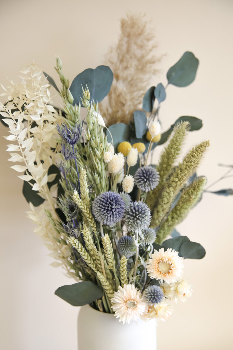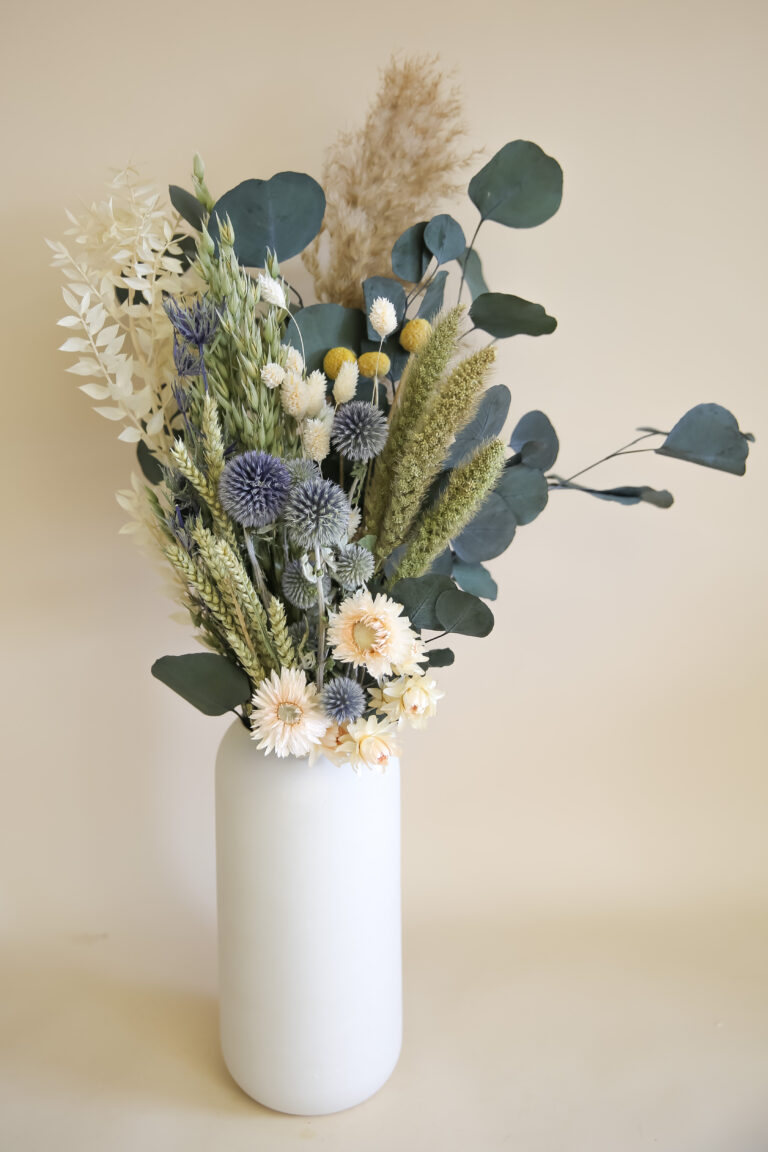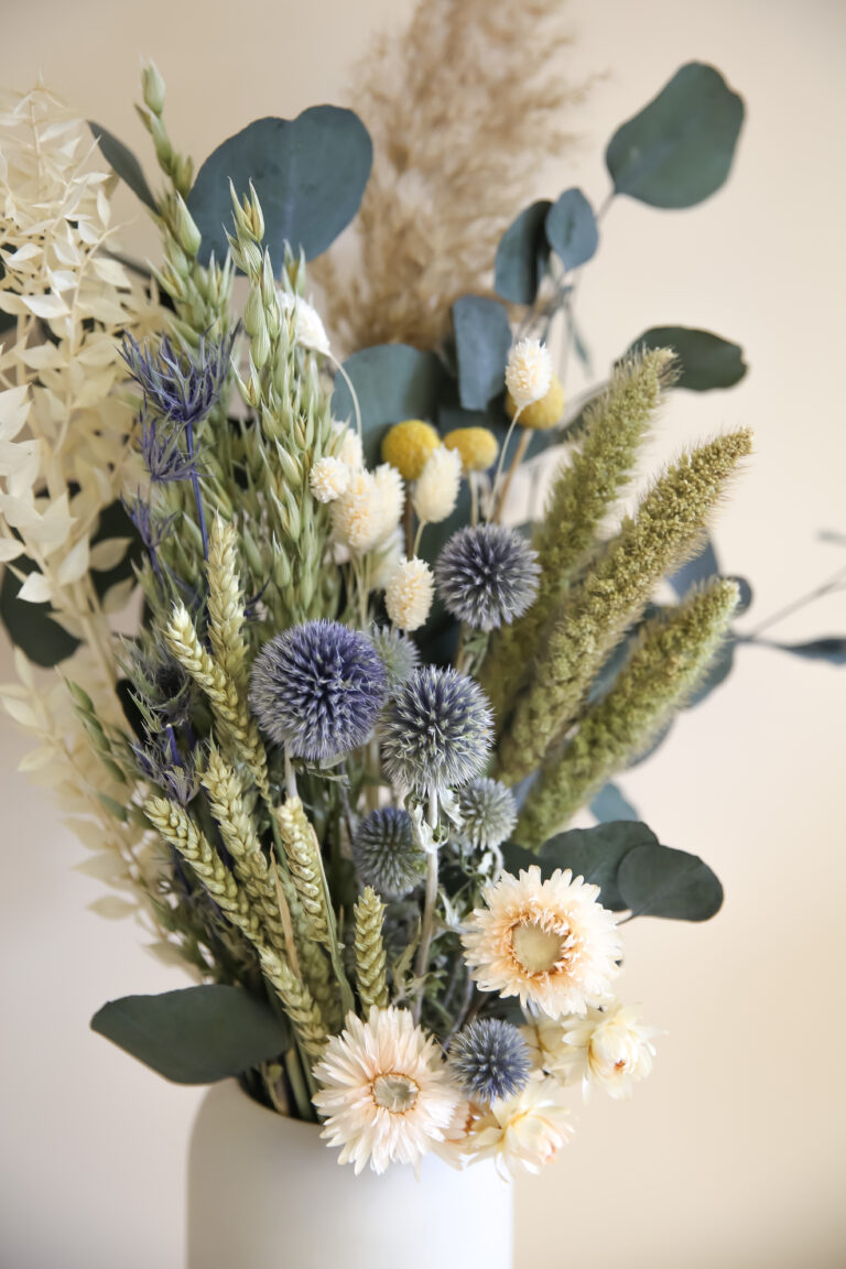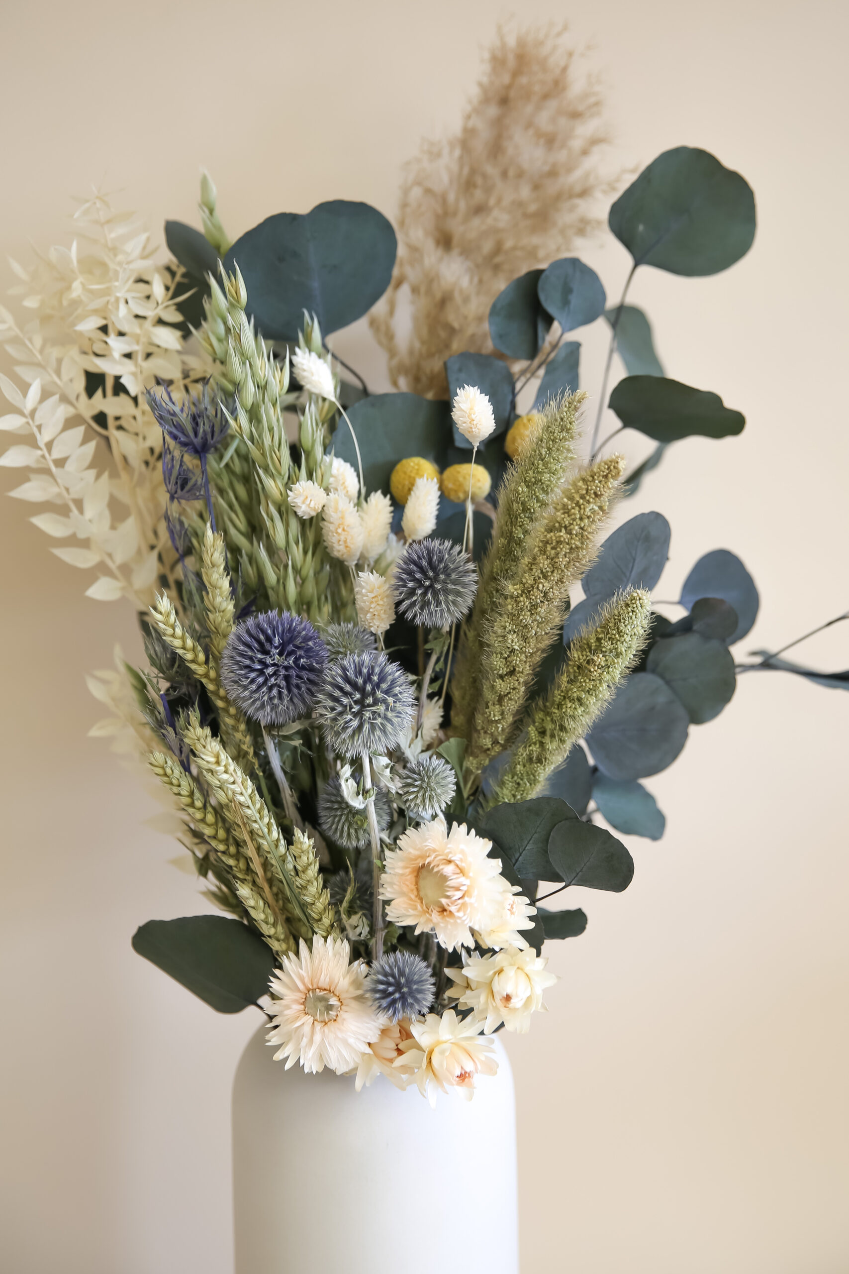 Nordic Calm ist ein handgebundener Trockenblumenstrauss, der mit seiner ruhigen Farbpalette und natürlichen Struktur überzeugt. Grüner Eukalyptus bringt Frische und Leichtigkeit ins Arrangement und wird ergänzt durch zartes Pampasgras, weissen Ruscus, gelbe Craspedia, blaue Disteln und cremefarbene Strohblumen.