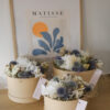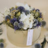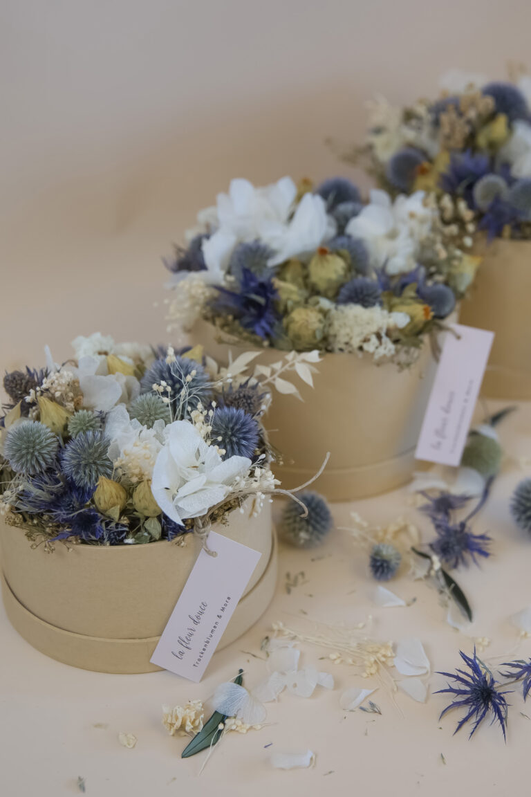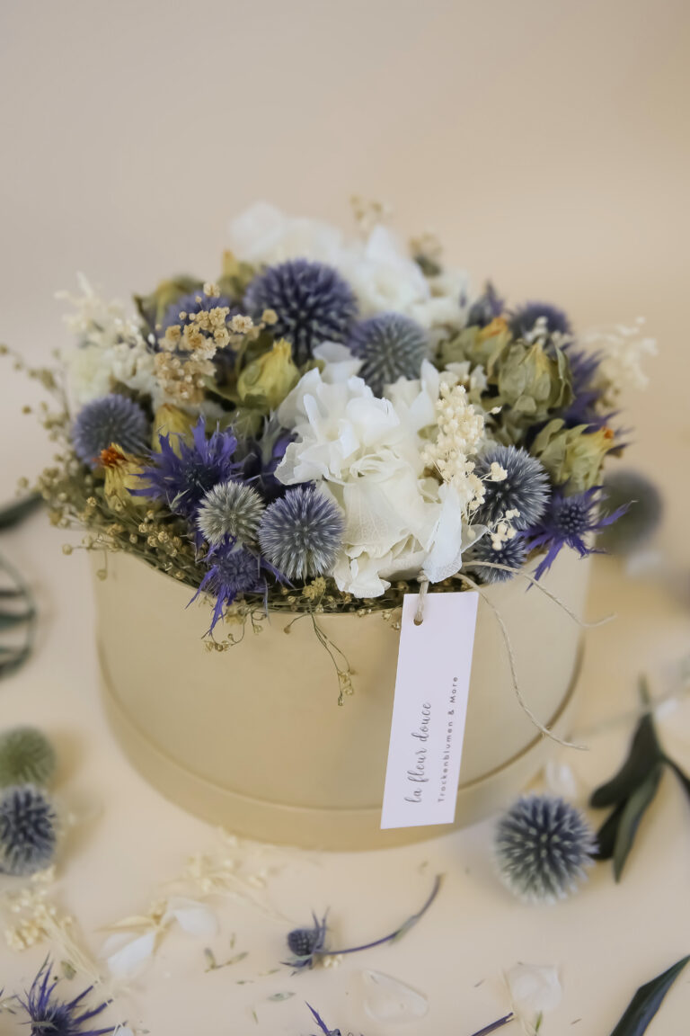 Unsere grosse Trockenblumen Winter Flower Box ist ist ein Highlight für alle, die winterliche Eleganz lieben. Im Zentrum stehen strahlend weisse Hortensien, umrahmt von silbrig grünen Akzenten, tiefblauen Disteln und zarten Naturtönen. Dieses grosszügige Arrangement bringt die kühle Schönheit des Winters in jeden Raum und sorgt für einen stilvollen, festlichen Akzent.