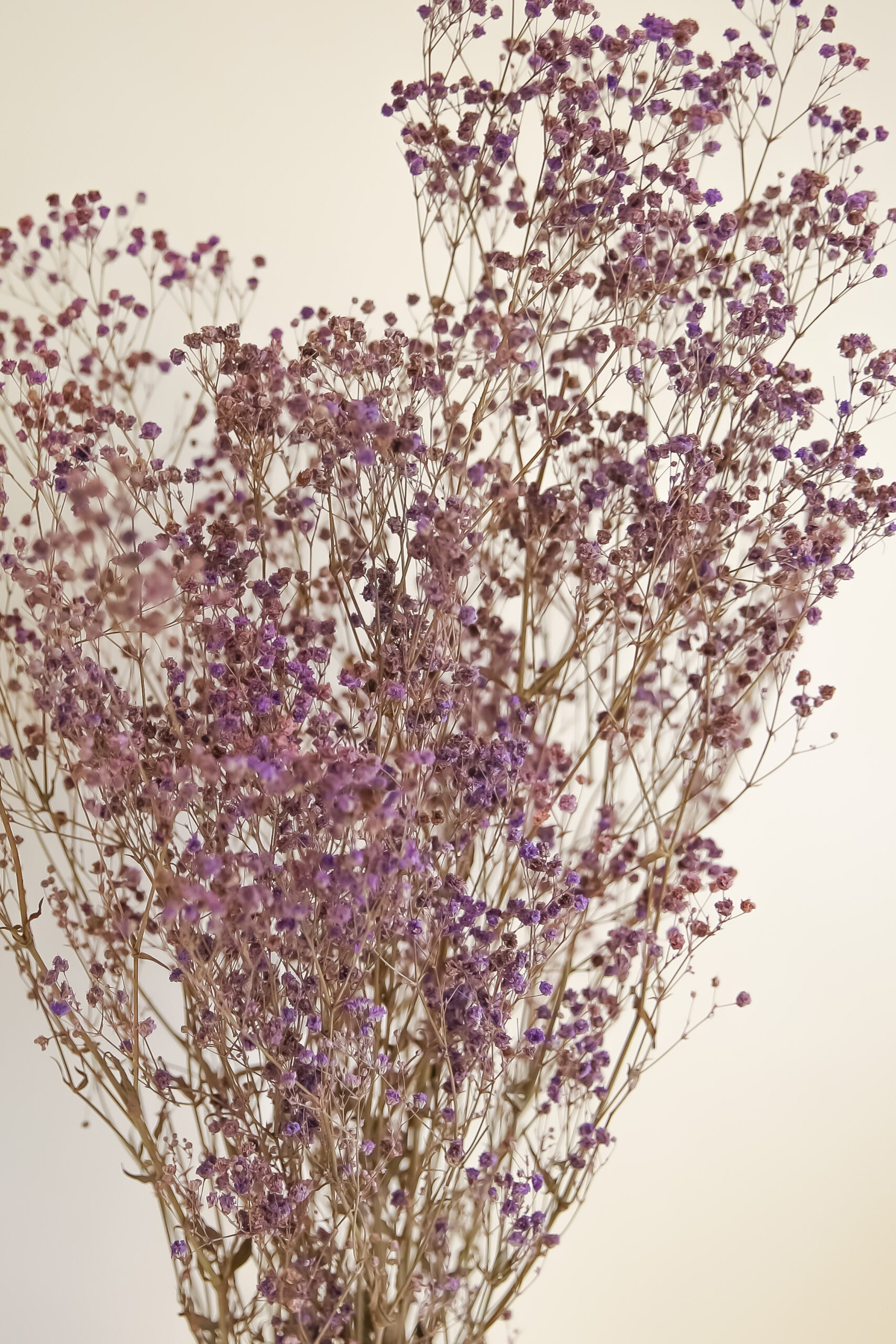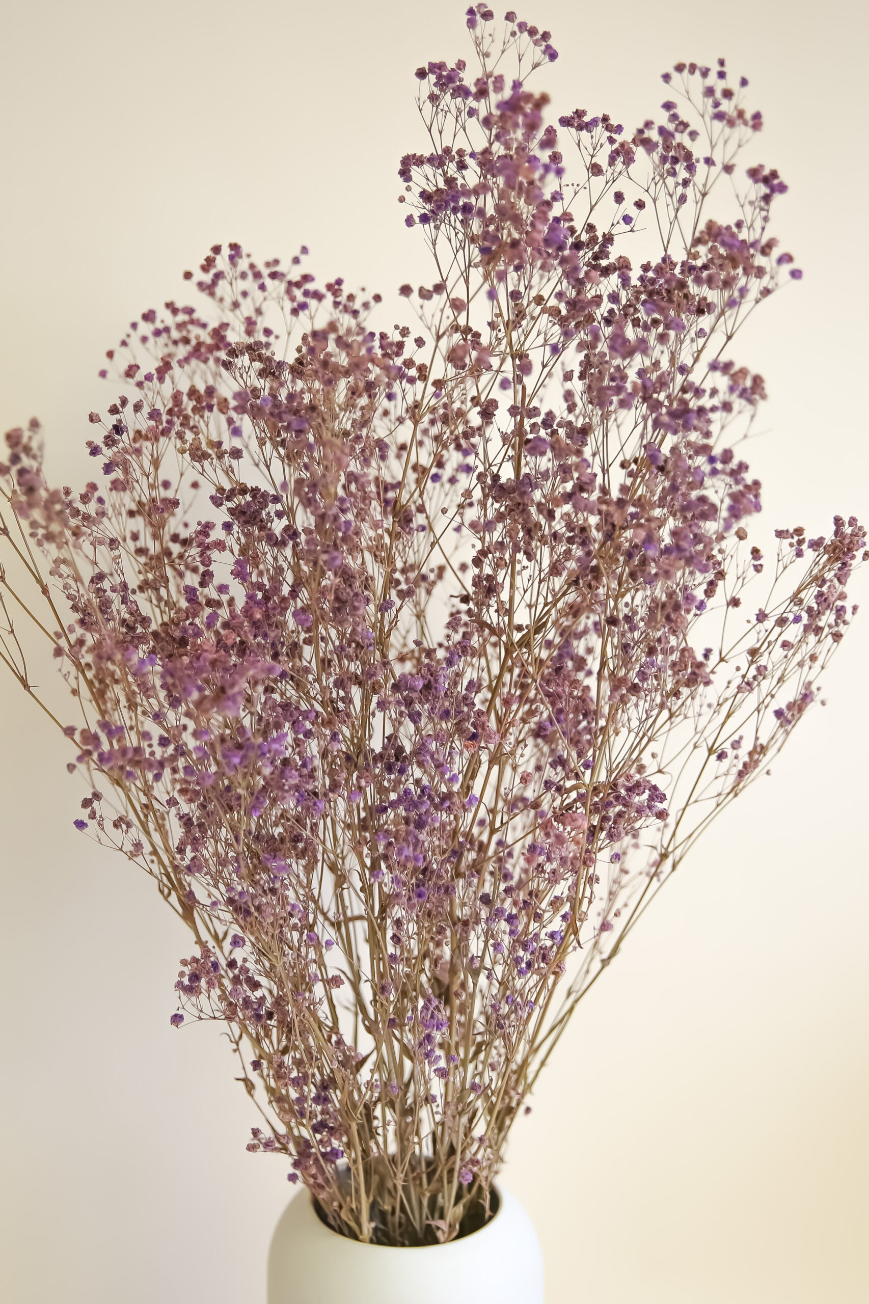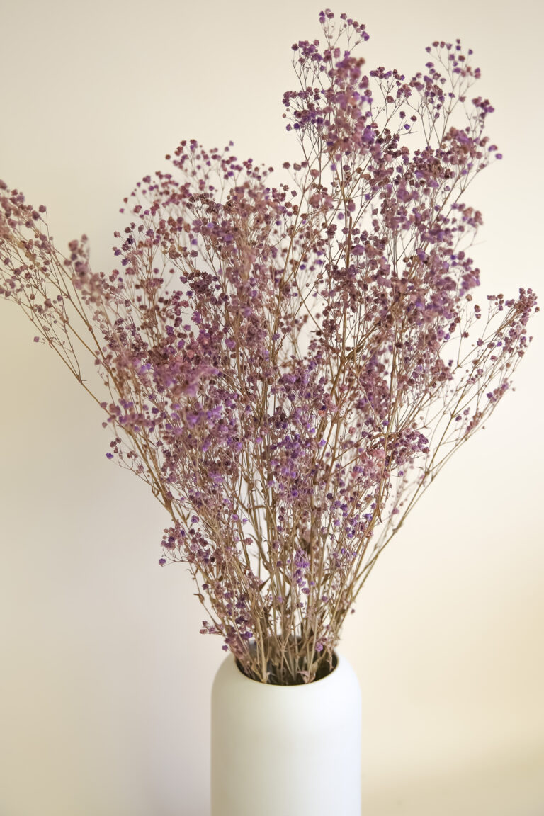 Die Gypsophila Lila bezaubert mit ihren feinen, violetten Blüten und verleiht jedem Raum eine natürliche, zarte und luftig leichte Atmosphäre. Die sanfte Lilafarbe wirkt harmonisch, modern und bringt eine elegante Farbnuance in deine Dekoration. Dank ihrer getrockneten Form ist sie besonders langlebig und pflegeleicht, ideal für nachhaltige Arrangements ganz ohne Wasser.