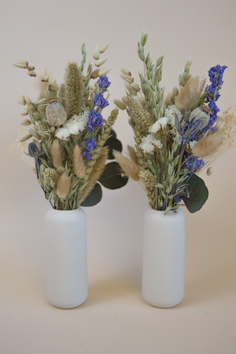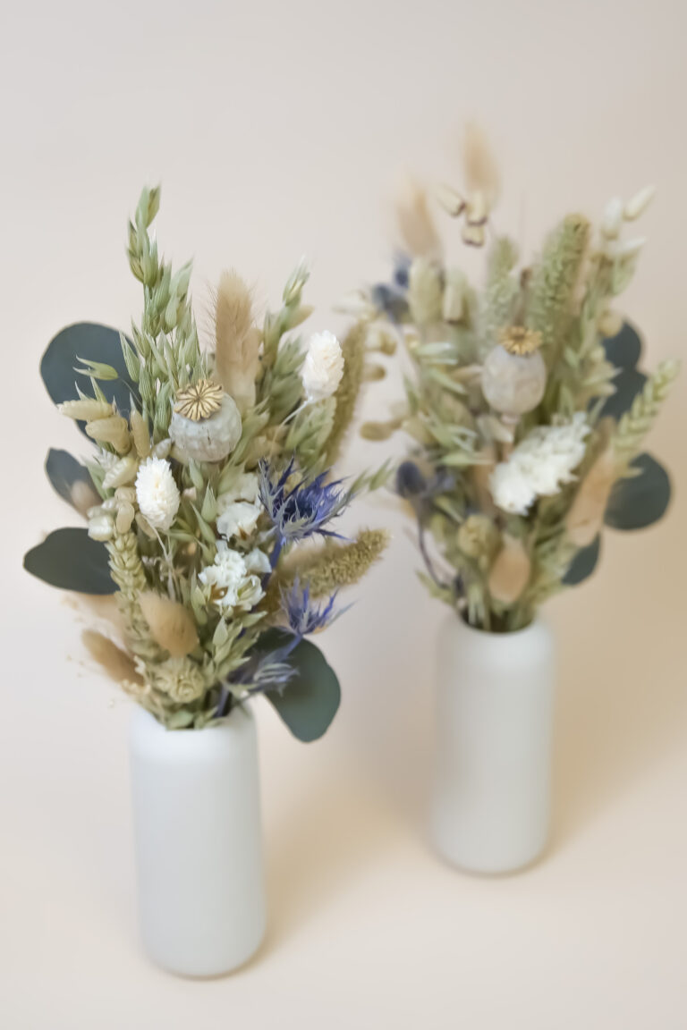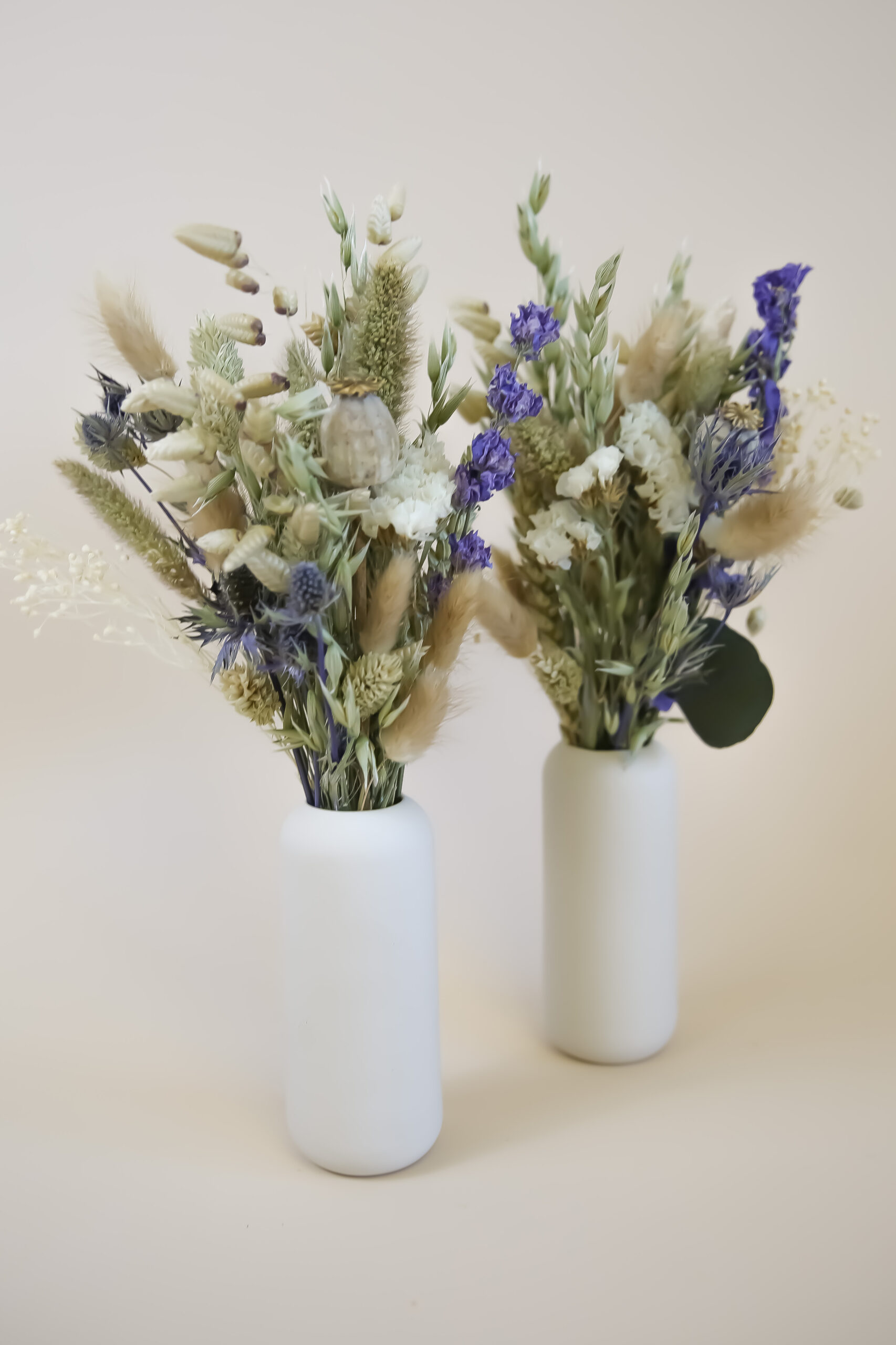 Die ideale Kombination: Zwei handgebundene Trockenblumensträusschen Bleue Lune in sanften Naturtönen mit zarten blauen Akzenten. Perfekt als Geschenk oder als stilvolle Dekoration für dein Wohnzimmer, Sideboard oder den Nachttisch.