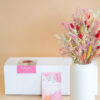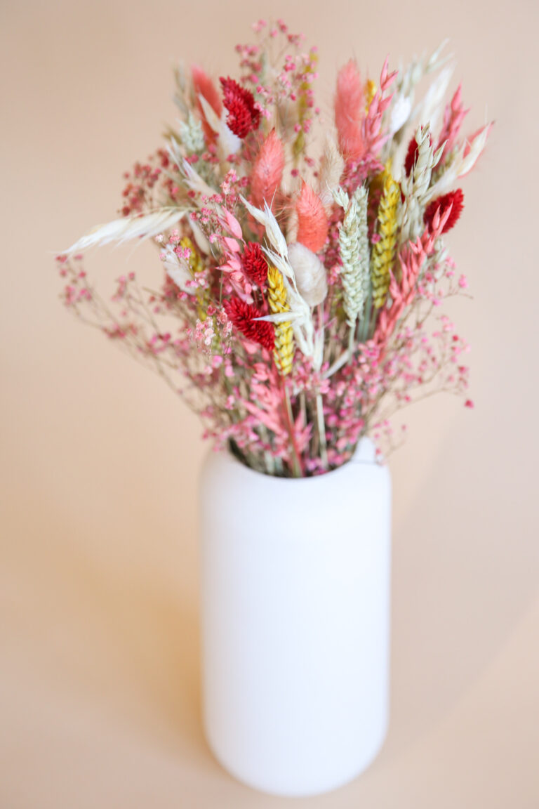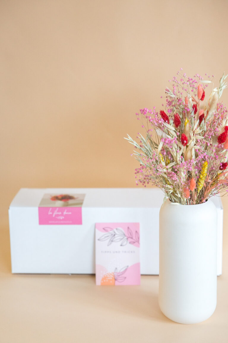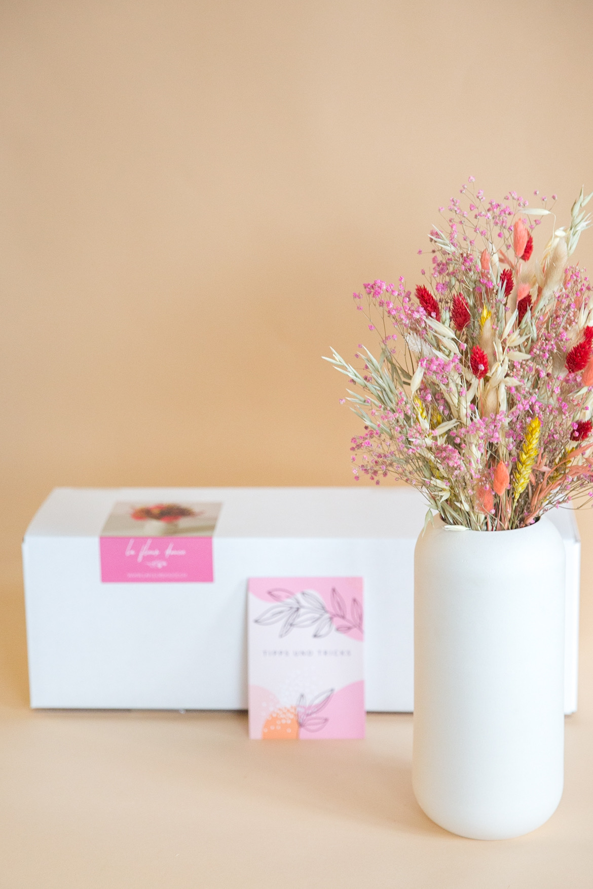 Die ideale Kombination für die sonnigen Tagen: Vase Fleur Douce und der Trockenblumenstrauss Harmony mit seinen fröhlichen Farben rot, gelb und rosa passen perfekt zusammen. Das Set aus Vase und Trockenblumenstrauss ist ideal zum Verschenken oder als Deko Element für die eigene Wohnung.